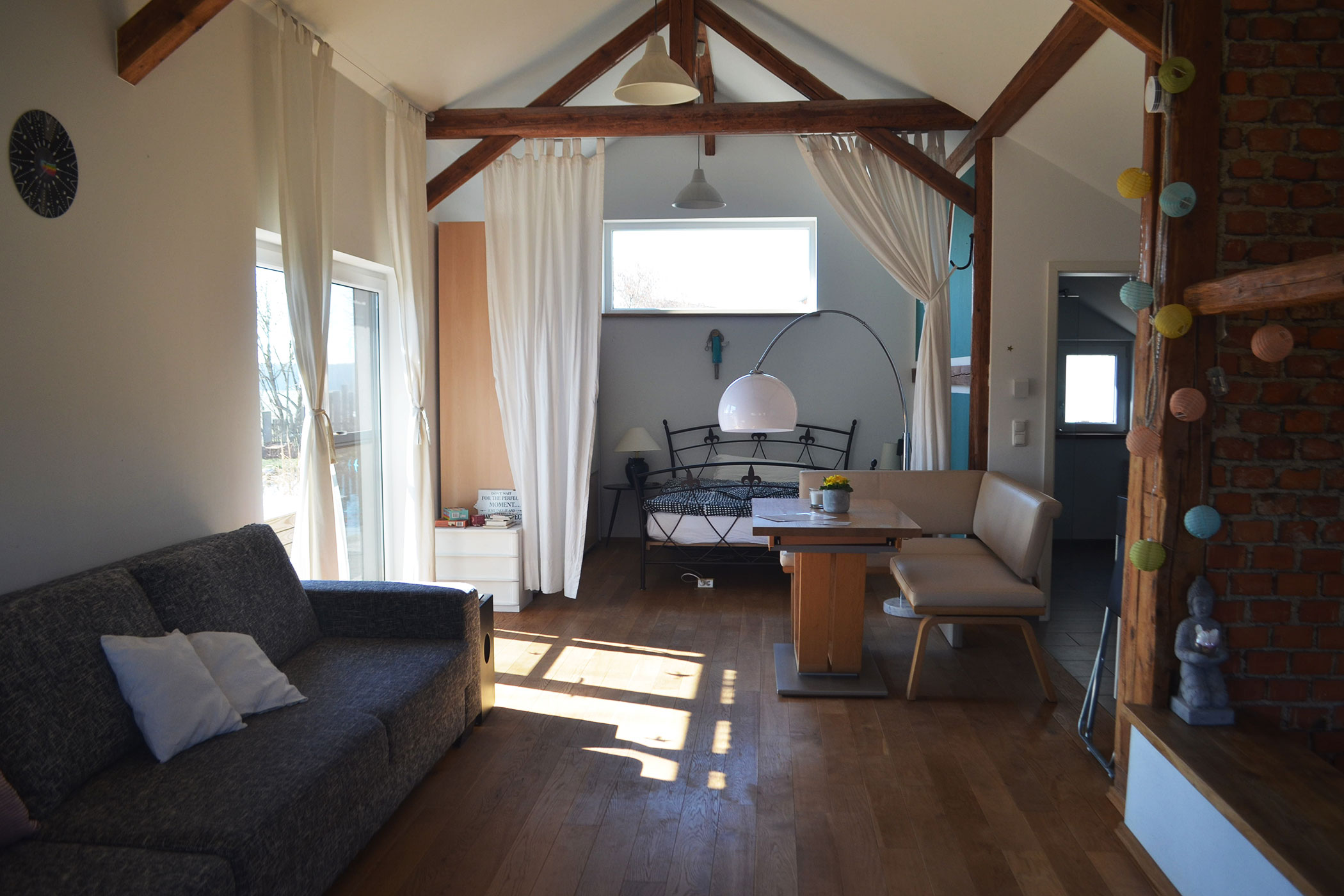 Wenn Du nach Norden schaust, bist Du mit den Augen im Himmel und fast schon im nahe gelegenen Wald, im Westen gibt es die riesige Dachterrasse und spektakuläre Sonnenuntergänge.